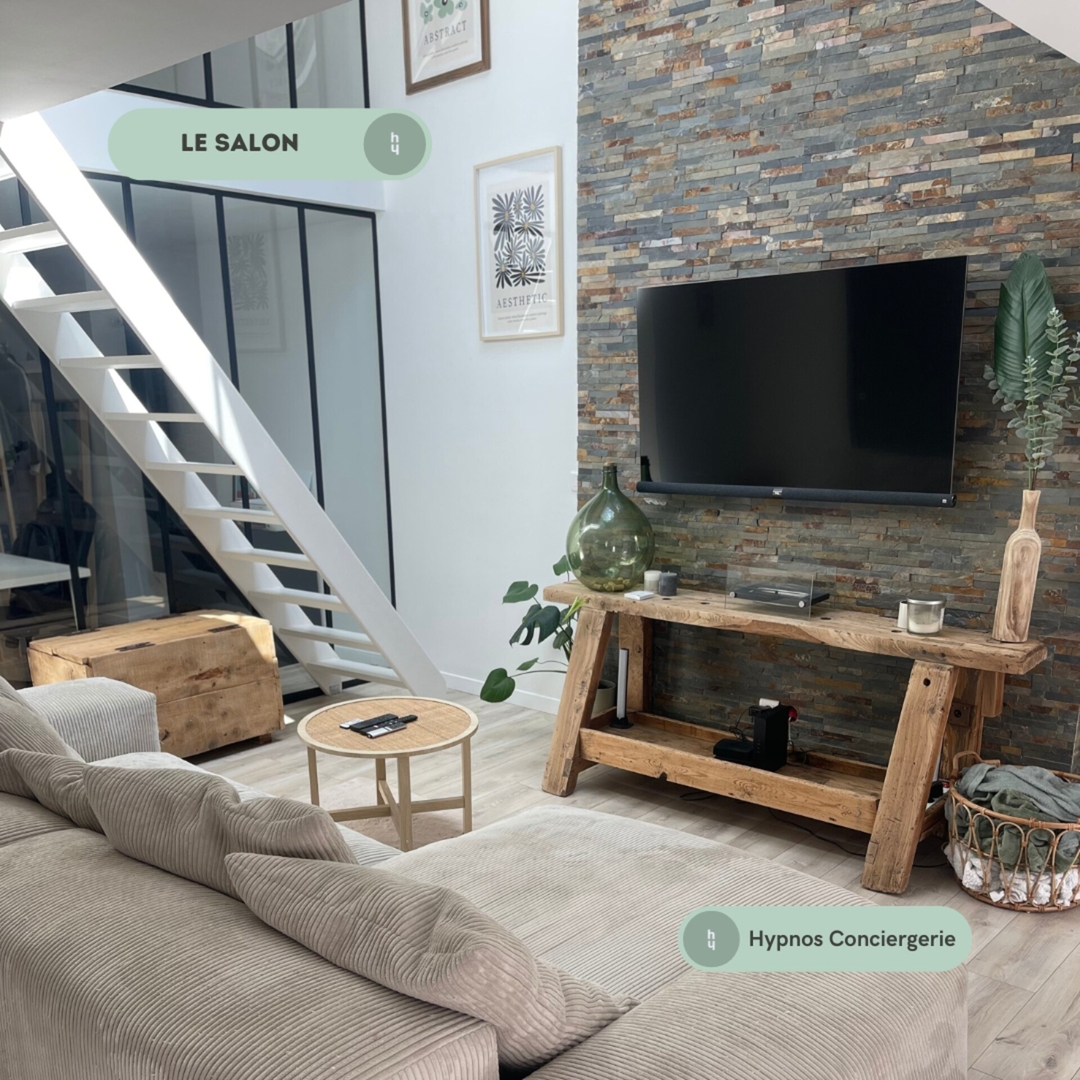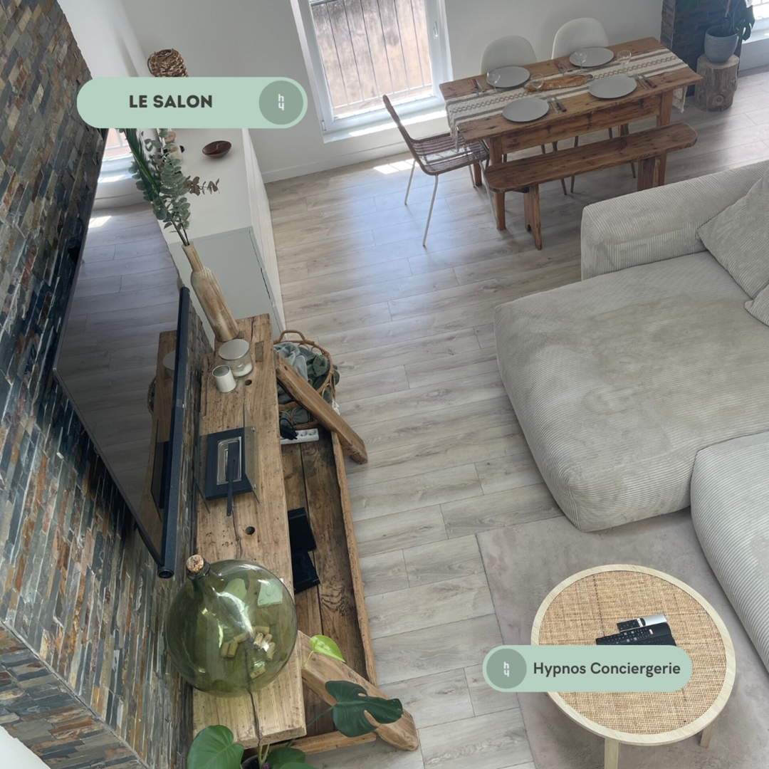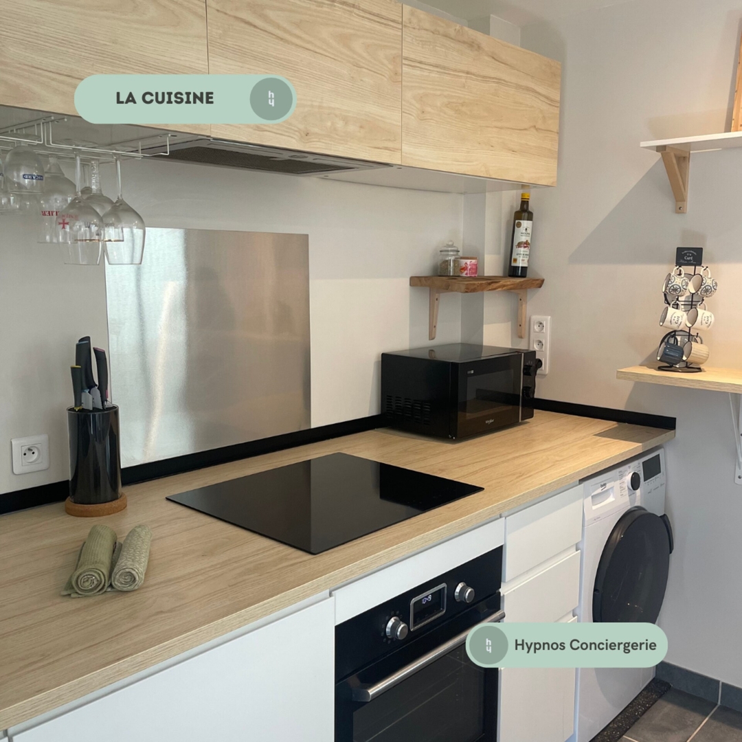 L'appartement, lumineux et bien aménagé, offre tout le confort nécessaire pour un séjour agréable. Il dispose de deux chambres confortables, d'un salon spacieux avec un canapé, et d'une cuisine entièrement équipée pour préparer vos repas après une journée de découverte. La salle de bain moderne est dotée d'une douche pour un moment de détente bien mérité.