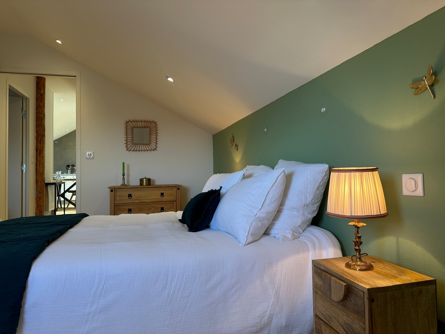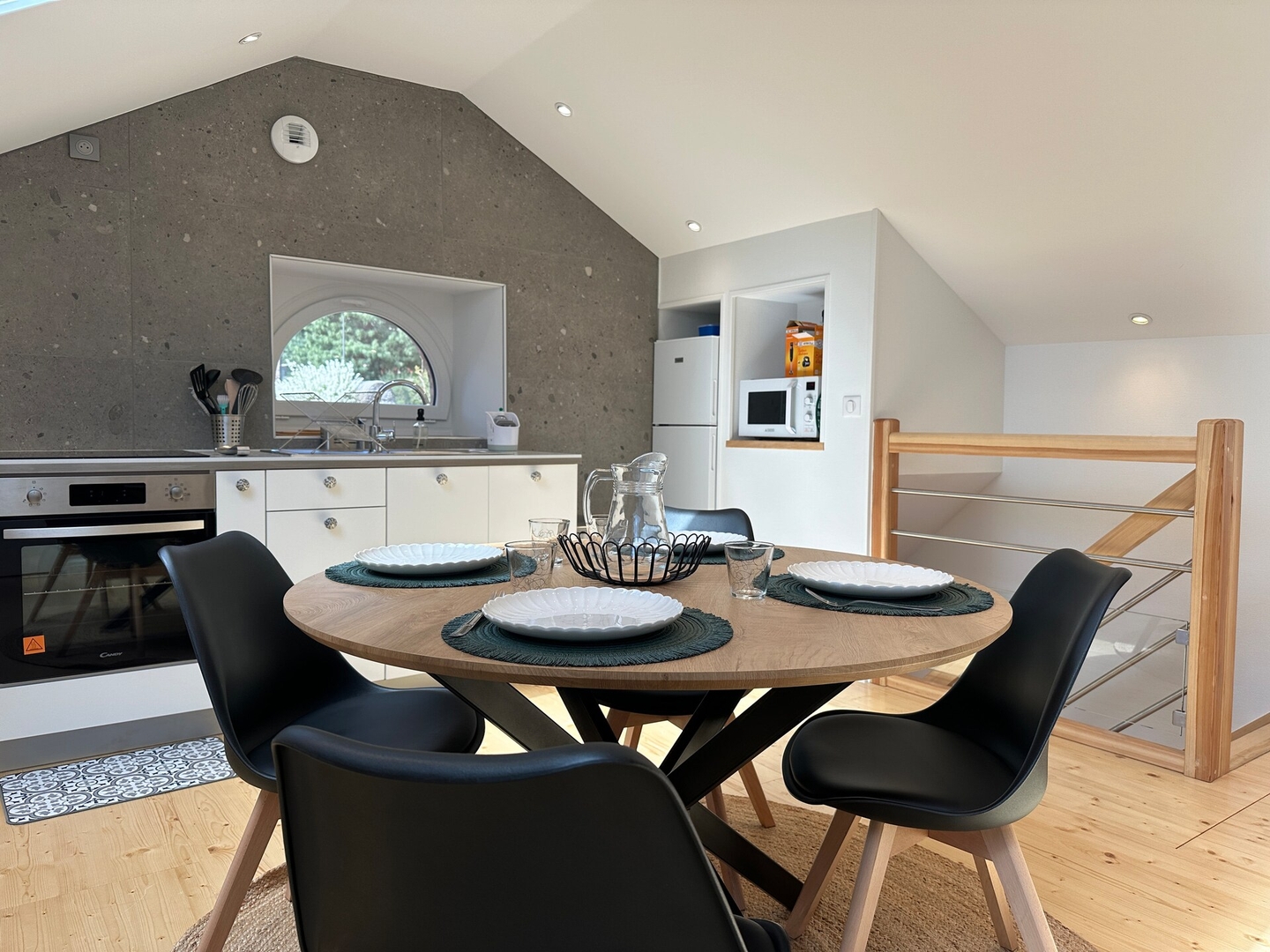 ✨L’espace de vie sous les toits offre une atmosphère douce et lumineuse, idéale pour se détendre. Profitez d’une cuisine moderne entièrement équipée (plaques, four, micro-ondes, cafetière, bouilloire…), d’un espace repas convivial et d’un salon cosy avec canapé et coin lecture.