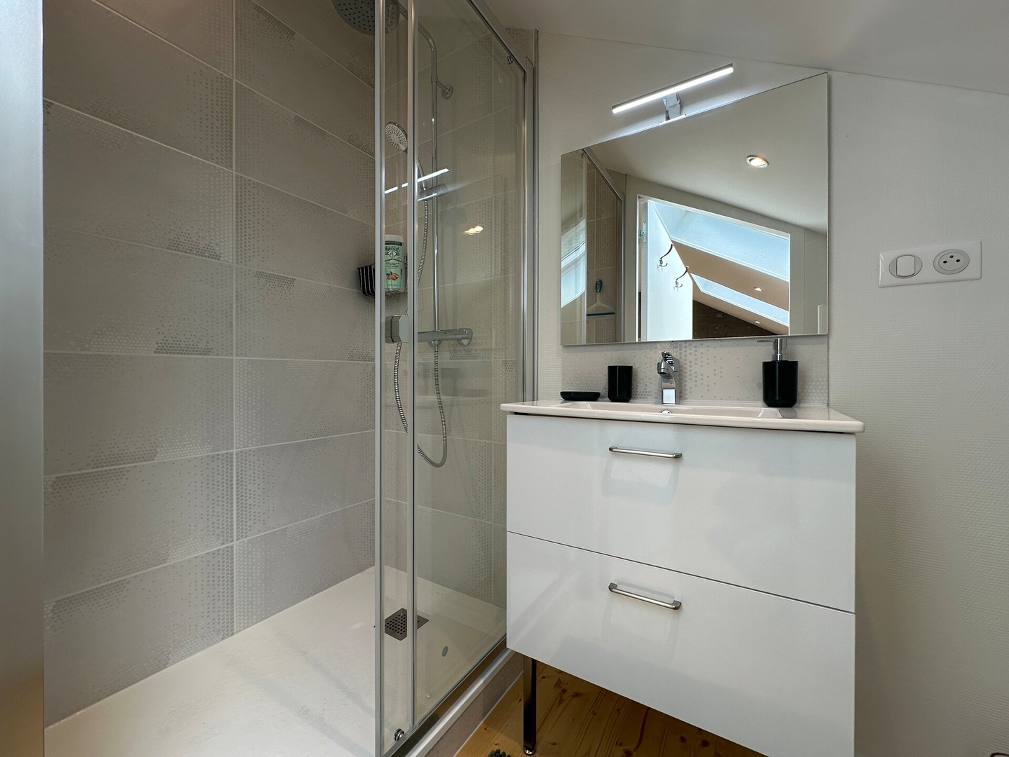 Une salle de bain moderne avec douche à l’italienne et WC complète l’ensemble.