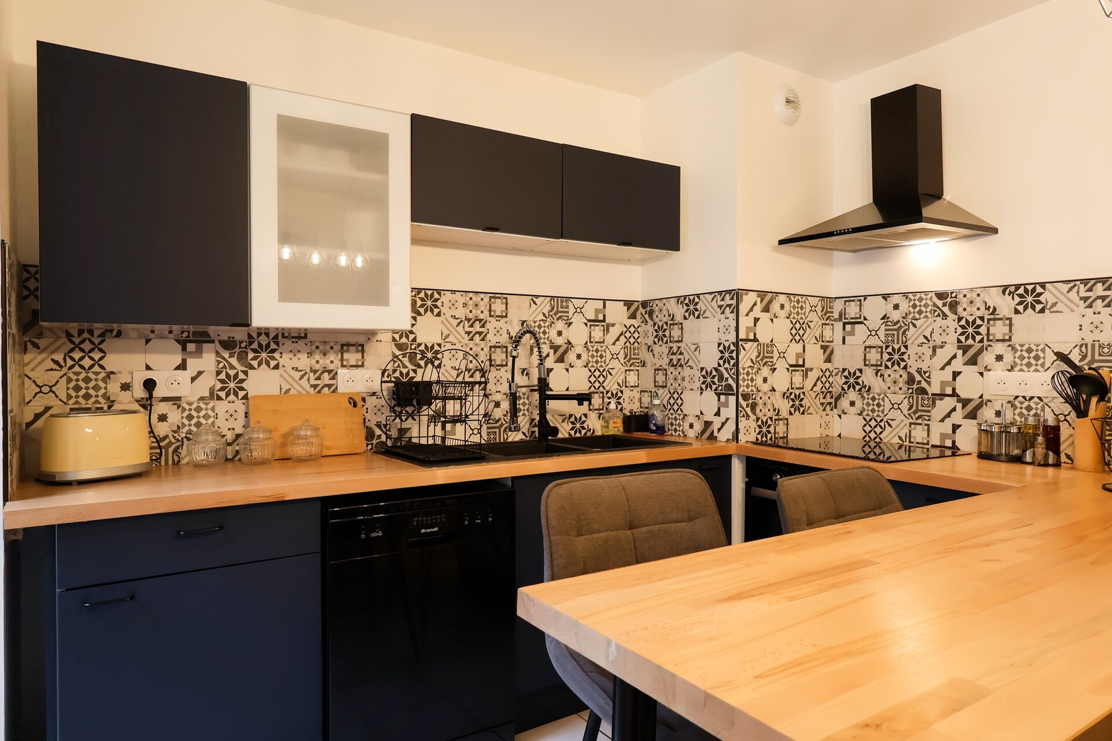 La cuisine entièrement équipée, avec notamment un lave-vaisselle, vous permettra de profiter pleinement de votre séjour, que ce soit pour quelques nuits ou plusieurs semaines. L’appartement dispose également d’une connexion Wi-Fi, d’une TV connectée, et de nombreux espaces de rangement, dont un dressing pratique et fonctionnel.